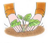 植えつけは、アブラナ科の連作を避けて,場所を準備します。植えつけの2週間前に,苦土石灰を1m2当たり100g散布し、よく耕します。1週間前に、畝幅60~70cmとし、中央に深さ20cmの溝を切って、堆肥を1m2当たり2kg、粒状肥料「マイガーデンベジフル」1m2当たり200gまいて土を戻し、平畝をつくります。 株間を40~45cmとって植え穴を掘り、苗を植えつけます。土が乾いている場合は、植え穴にたっぷりと水を注いでから植えつけます。