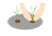 8月末、標準型のプランターを用意し、プランターの底が見えなくなるぐらい鉢底石や軽石を敷きます。次いでウォータースペースを1~2cmとって用土1ℓ当たり粒状肥料「マイガーデンベジフル」を7gを混ぜた培養土を入れ、土の表面を平らにします。平らにした表土に、子球を10cm間隔で置き、先端が少し隠れるぐらいの深さに埋め、たっぷり水やりをします。その後も土の表面が乾いたらたっぷりと水やりします。水のやりすぎに注意しましょう。