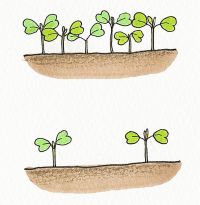 発芽し、双葉が完全に開いたら、生育がよいものを残して、3~4cmに1株になるように間引きます。間引いた後は株元に軽く土寄せし、株が倒れないようにします。