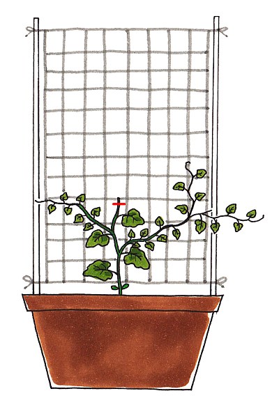 孫づるに着果させるための仕立て方をします。本葉が3~6枚になったら摘心し、わき芽(子づる)を出させて、ネットに誘引します。生育のよい子づるを1~3本残します。子づるの4枚目(庭植えの場合)~8枚目(プランター植えの場合)までの葉腋から出たわき芽(孫づる)は早めにかきとり、それ以降に出る孫づるを伸ばしてネットに誘引して、それに果実をつけさせます。