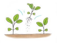 間引き2と同時に、中耕を兼ねて、株元へ軽く土寄せしましょう。さらに、液体肥料「マイガーデン液体肥料」や「花工場原液」か「ベジフル液肥」を500倍に薄めて、水やりがわりに与えます。その後も同様に、週に1回与えます。