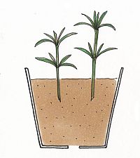 ローズマリーは、3タイプとも、主にさし木でふやします。5月中旬から6月中旬に若い枝を切り取り、2節ずつに切りそろえます。下部の切り口を30分程水に浸して水揚げさせてから、さし木用土にさしていきます。約20日後には発根し、約30日後に十分に発根したのを確認したら、ポリポットに植え替えます。さし木する枝は、若い枝の方が発根しやすく、また生育も早くなります。堅く木質化した枝は発根しますが、若い枝の倍ぐらい発根や生育に時間がかります。焦らずに、じっくりと根が出るのを待ちましょう。