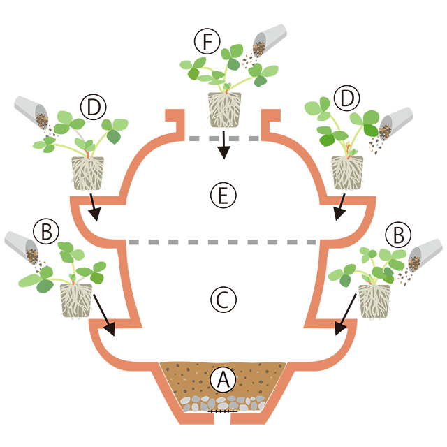 イラストのA~Fのアルファベット順のように、ストロベリーポットの底部に用土を入れ、ポケットに苗をさし込んで植えて用土を足しながら植えていく。