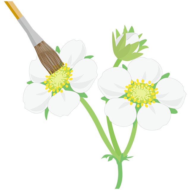 大きく形のよい果実をつけさせるために、人工授粉を行ないます。特に寒い時期は、花粉を運ぶ昆虫がまだ少なく、マンションの高層階のベランダには昆虫が飛来しにくいので、人工授粉が効果的です。
