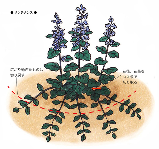 開花直後は、株全体がやや乱れた状態になるので、早めに花がら摘みを兼ねた切り戻しを行ないましょう。株姿を整えると蒸れを防ぐことができ、株の中心が枯れこんだりせず、再び美しい姿で楽しめるようになります。
