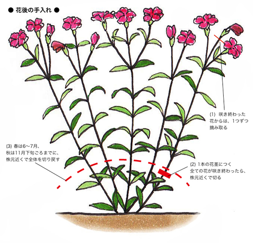 ダイアンサスは高温多湿が苦手なので、6~7月に切り戻しておかないと、蒸れて株の元気がなくなっていきます。切り戻し忘れて夏に株が弱ってしまった場合は、葉がついたところを残して切り戻し、肥料ではなく活力剤を与えて、株の体力を回復させましょう。