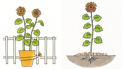 ヒマワリは直根性の植物のため、移植を嫌います、育てる場所に直まきにするか、ポリポットにタネまきし、本葉3~4枚の頃に、育てる場所や大きめのコンテナに定植しましょう。タネまきは、ソメイヨシノが散った頃に行います。タネまきが遅れると、高性種でも草丈がうまくのびないことがあります。