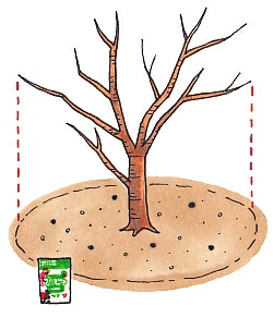 庭植えの場合は、粒状肥料「マイガーデン植物全般用」を1m²当り150gを、根の張っている範囲(枝の張っている部分とほぼ同じ)の土の上にばらまいて浅く埋め込みます。
