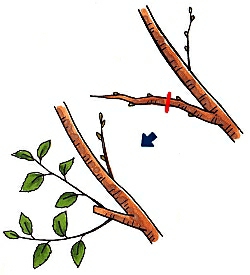 根元から出るひこばえや幹から出る枝は、樹勢を弱くする原因となるので、見つけ次第、根元から切り除きます。また、前年に伸びた枝から勢いよく伸びる徒長枝は、基部の2~3芽を残して秋に剪定します。なお、切り口から腐敗菌が入りやすいので、必ず殺菌剤「トップジンMペースト」