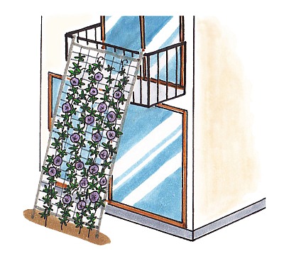 植えつけ時に、つるもの用ネットと支柱を準備します。つるは5~8m以上に伸びるので、2階建ての家であれば、2階のベランダまで伸ばしてみましょう。ネット以外では、麻紐などが便利で、つるをまっすぐにのぼらせたいときに有効です。