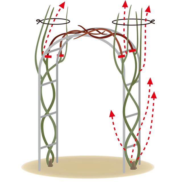 アーチ仕立てでは、アーチの天井からはみ出した枝を、赤い線の位置で切る。