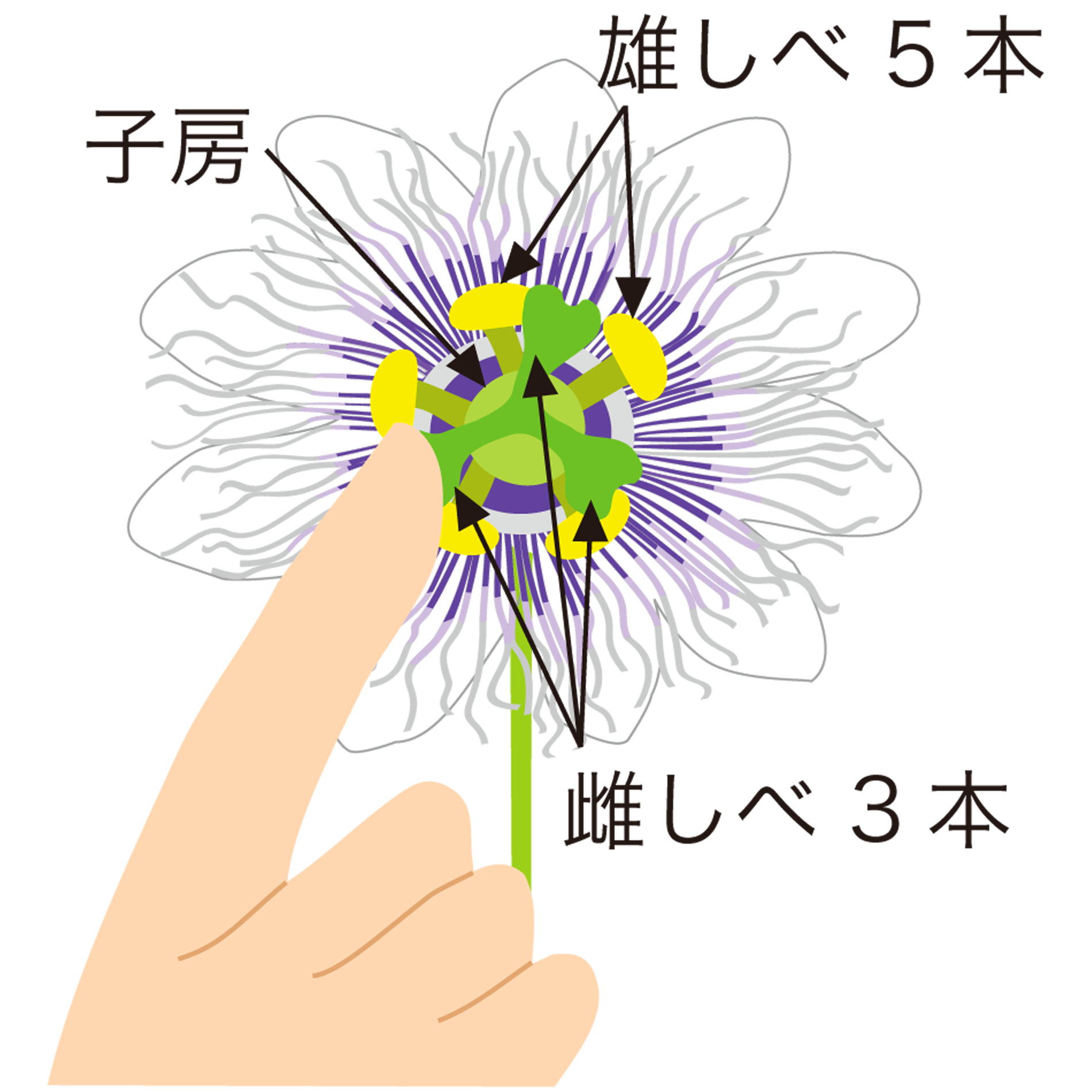 学名のパッシフローラ(Passiflora)は、受難を意味する単語パッション(passion)に由来します。花の雄しべと雌しべの形から、十字架にかけられたイエス・キリストの姿を想像し、「受難の花」と呼ばれるようになったともいわれています。