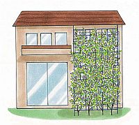 つるは3m以上に伸びるので、2階建ての家屋であれば、2階のベランダまで伸ばしてみましょう。ネットの両端には丈夫な支柱や金属パイプを通し、しっかり固定しておきます。ネット以外では、麻ひもなどに誘引するのが便利で、つるをまっすぐにのぼらせたいときに有効です