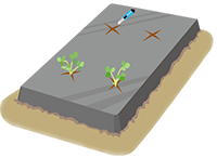 2月~3月、幅95cmの黒マルチをイチゴの株の上からかけ、マルチの周囲を土で押さえます。マルチの上からイチゴの株を探り、マルチを破ってイチゴの株を上にのぞかせます。果実が汚れるのを防ぎ、地温を上げるのに効果があります。