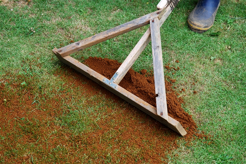 目土は芽の出る前に5㎜程度の厚さになるようにまき、トンボで全体に平らにならす。1~2年に1回行うと、表面の凸凹をなくし生育もよくなる。