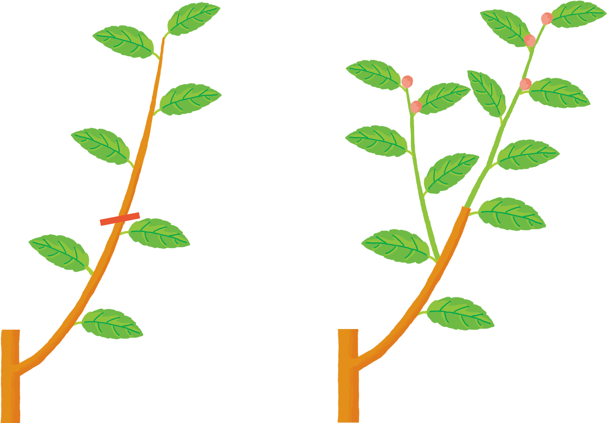 元気のよい今年伸びた枝(新梢)の先にできる芽(頂芽)が花芽になり、翌年に開花するタイプ。このタイプは、花芽がつくられてから枝先を刈り込むと翌年花が咲かなくなるので、花後すぐ剪定し、残した芽から元気のよい枝を出させるようにします。