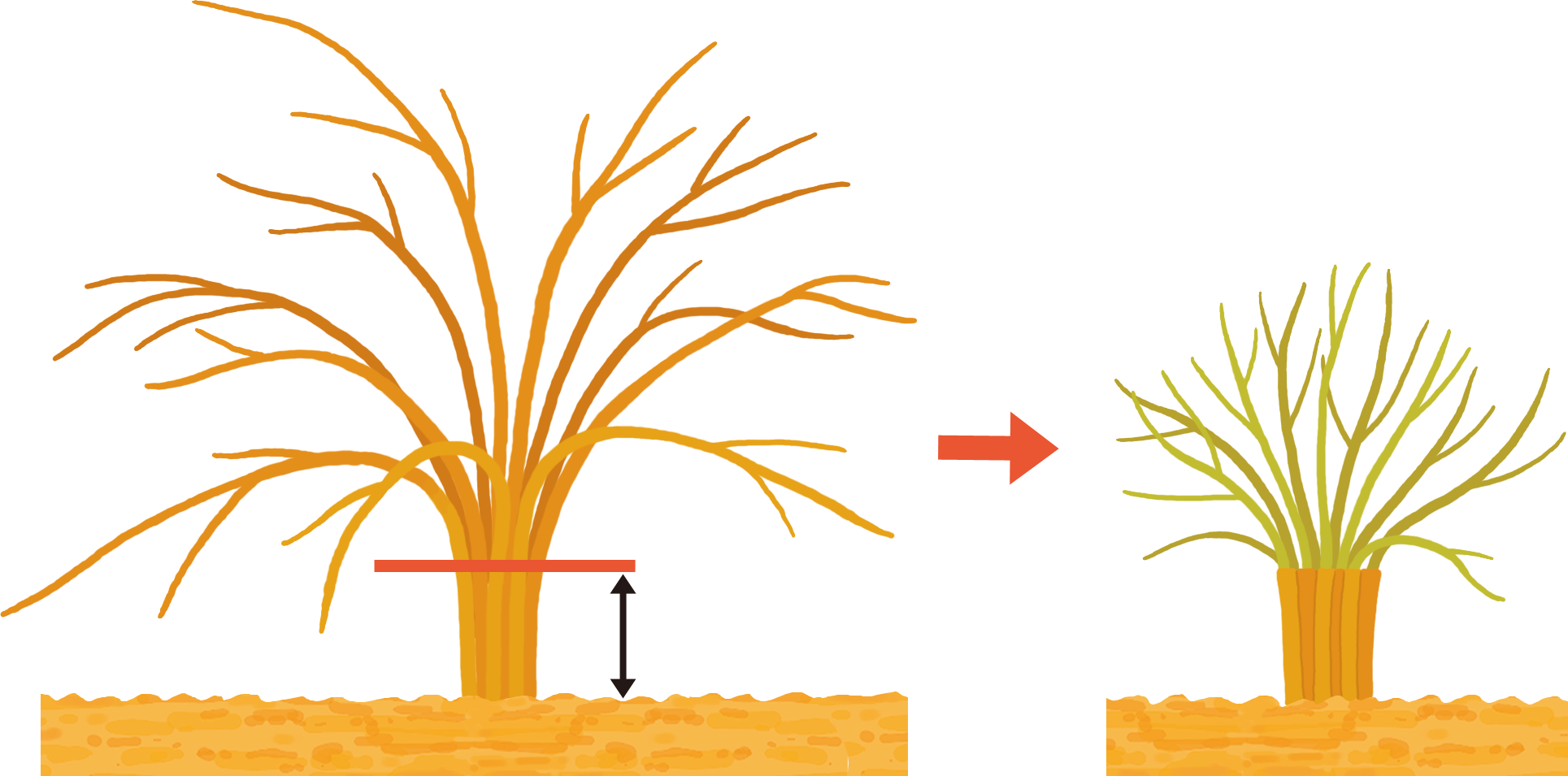 花が終わった枝を放任すると丈が高くなり、弱い枝がたくさん出るため、冬に株元を10㎝ほど残して切る。