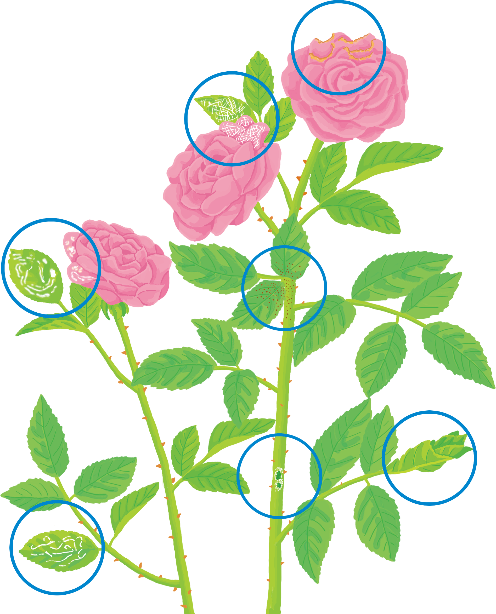 大事に育ててきた植物を病害虫から守るには、植物をよく観察し、こまめにチェックして早期発見すること。早期に発見すれば、被害の拡大も防げます。病害虫の種類も症状もさまざまですが、発見のためのチェックポイントは同じです。日ごろから葉の裏などもよく観察して、植物が出すサインを見逃さないようにしましょう。
