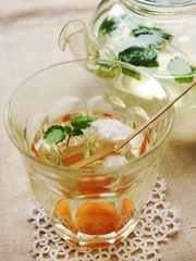 グラスにProcess 2 のキンカン1個と適量の煮汁を入れ、レモンバームなどの柑橘系の香りがするハーブティーを注ぎます。さわやかなハーブティーに、キンカンのコンポートで甘味を添えました。