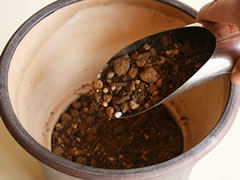 根鉢が隠れるように、Process 1 の培養土を入れます。鉢をトントンと軽く床に打ちつけ、減った分の培養土を足します。