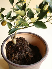 柑橘類の株をプラポットから取り出し、根鉢の表面の土を軽く削り落としてProcess 2 の上に置きます。