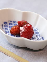 洗って水気を拭き取った果実に、市販や手づくりした塩糀を適量まぶします。塩糀は味わいや塩分が製品によってさまざまなので、ごく少量から試してみてください。今回はラズベリーとワイルドストロベリーの果実合計10粒に対し、塩糀小さじ1/2量を加えました。