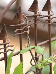 ◎ラズベリー'マイラビット'は、樹高30cmほどにしかならない矮性品種。放っておいてもブッシュ状に育ちますが、支柱やミニフェンスをバスケットにさし、ときどき枝を誘引すると、風通しがよくなります。