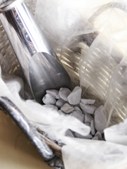 バスケットに不織布を敷き込み、鉢底石を入れます。