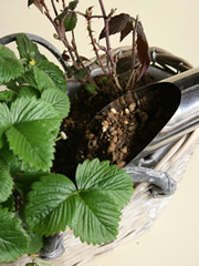 もうひとつのベリー(ここではワイルドストロベリー)をポリポットから取り出し、同様に根鉢を軽く崩してProcess 4 の横に置き、根鉢が隠れるように、Process 2 の培養土を入れます。鉢をトントンと軽く床に打ちつけ、減った分の培養土を足します。