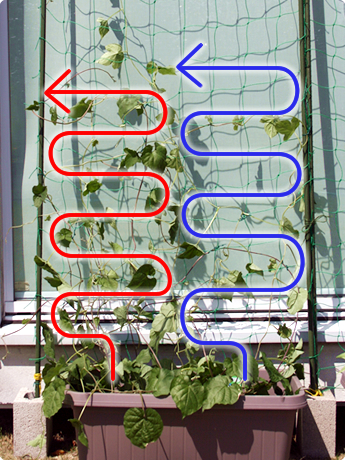 今回はプランターに2株植えたから、つるが重ならないように矢印のようにクネクネ〜って誘引するといいらしいよσ(゚ー゚*)フムフム