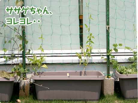 ノアサガオやミニゴーヤーと同じように、ササゲもやっぱり上へ上へと伸びていく。巻きついちゃったつるをそっとはずして...