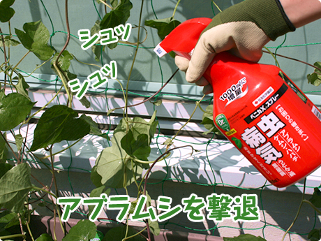 よ〜く見てみて、ちっちゃいアブラムシがついていたら、シュシュッと殺虫殺菌剤「ベニカXスプレー」で速効退治!