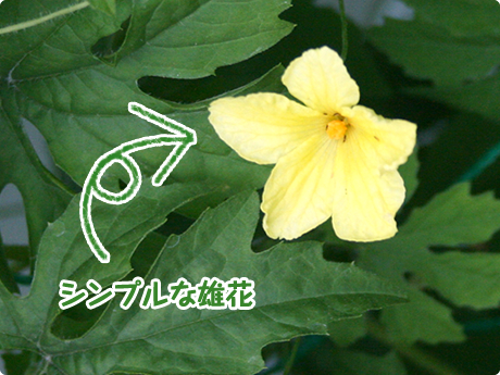 するとガーデニングの先輩トモちゃんが「ゴーヤーは雄花と雌花があるんだよ。さっきのが雄花で、お花のつけ根が実の形をしているのが雌花。