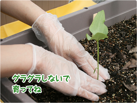 この間、ゴーヤーの苗を間引いたときと同じように、間引いた株の株元を手で軽〜く手で押さえておくのを忘れないようにしないとね☆