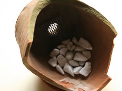 割れ鉢を好みの向きに置き、鉢穴に鉢底ネットを当てて、底部に鉢底石を敷きます。鉢皿を敷いて作業すると、安定して作業しやすくなります。