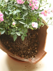 割れた鉢、花苗(ここではミニバラを使用)、鉢底石、鉢底ネット、培養土、粒状肥料「マイローズばらの肥料」
