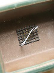 鉢穴に鉢底ネットを当てて、曲げたアルミワイヤーをさします。