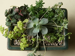浅い盆栽鉢でも、小さな多肉植物なら大丈夫。思わず虫眼鏡で観察したくなる楽しいひと鉢です。