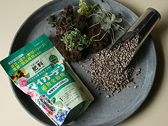用土に適量の粒状肥料「マイガーデン植物全般用」を混ぜておきます。一般的な植物の、1/3~1/2量ほどが適量です。