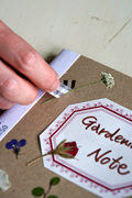 ノートにラベルを貼り、まずタイトルを書きましょう。次に、押し花に接着剤を薄く塗ります。