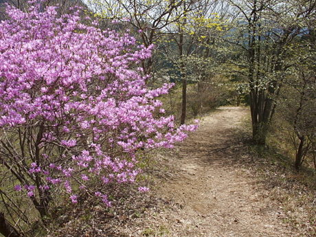 ハイキングコースに咲いていたミツバツツジです。みなさんもこのように見事な花全体をまずは写されることでしょう。しかし、これだけではただのミツバツツジの写真で、後で見たときにどこで撮ったのかも思い出せないことがあります。