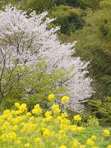 ここでは、桜そのものに加えて手前の新緑や菜の花がいっしょに咲く様子を撮りました。実際には手前の菜の花と桜との間には畑がありますが、 望遠レンズはその距離を縮めてひとつの絵にしてくれます。「庭の撮り方」と同じように、風景のなにもかも画面に入れようとはせず撮りたいものを強調することが大切です。ときには縦位置で撮ることも、前後の奥行きが出てより効果的です。