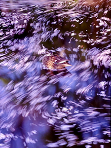 水面に散った花びらも桜の写真の絶好のテーマです。川など流れがある場合は、スローシャッターで写真ならではの動きのある表現ができます。その場合、三脚でカメラを固定し、岩や枝など動かないものを画面に入れて対比させると絵の中のアクセントになります。ここでは、石の上で休む鴨をいっしょに撮りました。