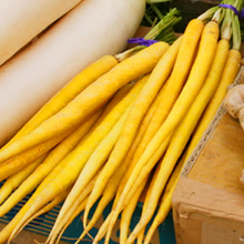 黄色い色をした東洋系ニンジン。現在一般的に流通しているニンジンは、江戸末期に渡来したといわれる西洋系ですが、かつては中国を経て17世紀にわたってきた東洋系ニンジンも広く作られていました。沖縄県の本島中部では、現在も島ニンジンという名称で、東洋系ニンジンが栽培、利用されています。