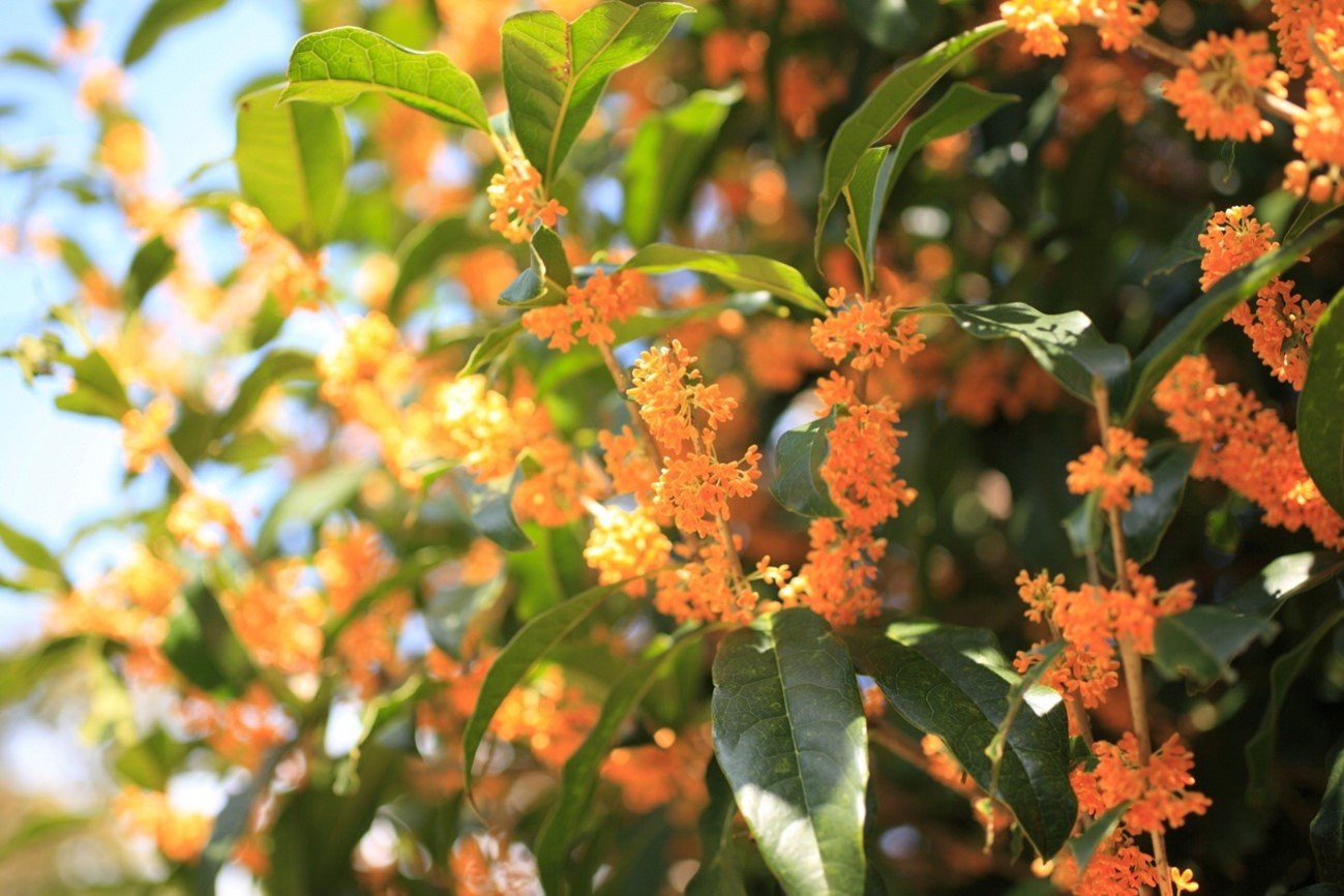 秋を代表する香りといえば、やはりキンモクセイです。モクセイ科モクセイ属の常緑小高木で、中国原産の園芸植物として知られています。濃い緑の葉のなかに明るいオレンジ色の小さな花が集まって咲く、かわいらしい姿が魅力です。