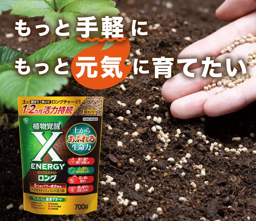 近年の植物栽培は、気候変動による異常気象・土壌疲弊など多くの課題に直面しています。KINCHO園芸が新たに開発した「X-ENERGY(エックスエナジー)ロング 粒タイプ」は、そのような状況下でも植物本来の力を引き出すバイオスティミュラント活力剤として注目を集めています。