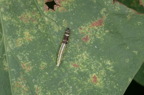 エカキムシは、透明に近い淡い黄色の体を持つ、長さ約4mmのハエの老熟幼虫です。葉に潜って食害し、葉に絵のような食害を与えるため、この名前で呼ばれています。ネギコガと似た白い筋を残しますが、不規則な線状の跡が特徴です。歯肉の内側に0.2mmほどの半透明のゼリー状の卵を産み付けます。
