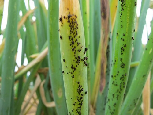 成虫と幼虫は葉の汁を吸い、被害箇所は葉の色が抜けて白いかすり状になるのが症状の特徴です。また、ネギえそ条斑病などの病気のウイルスを媒介することがあります。ネギえそ条斑病とは、アイリス黄斑ウイルス(IYSV)による新しい病害です。見つけたら農薬散布などで速やかに防除しましょう。