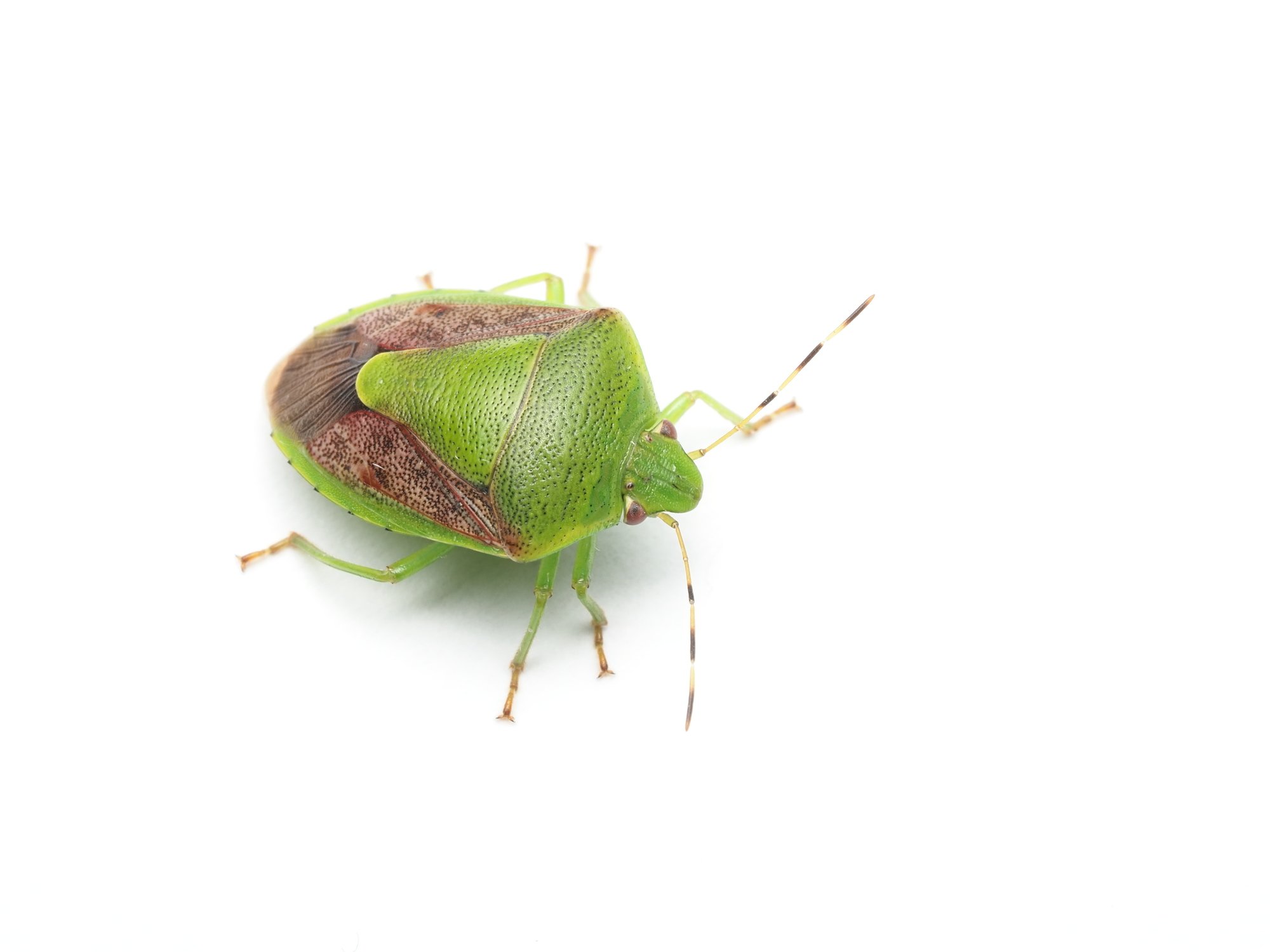 体長10~12mmで、光沢のある緑色の身体と茶色の翅を持つ食植性カメムシです。多くの植物を害し、特に種子や果実を好みます。夜中に灯火に集まり、屋内に侵入して悪臭被害を発生させることがあります。 |