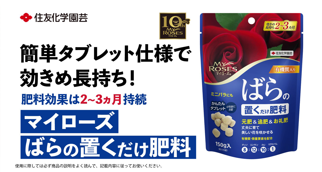 ●10号鉢以上や、地植えのばらに肥料を与える場合は「マイローズばらの肥料」の使用がおすすめ。